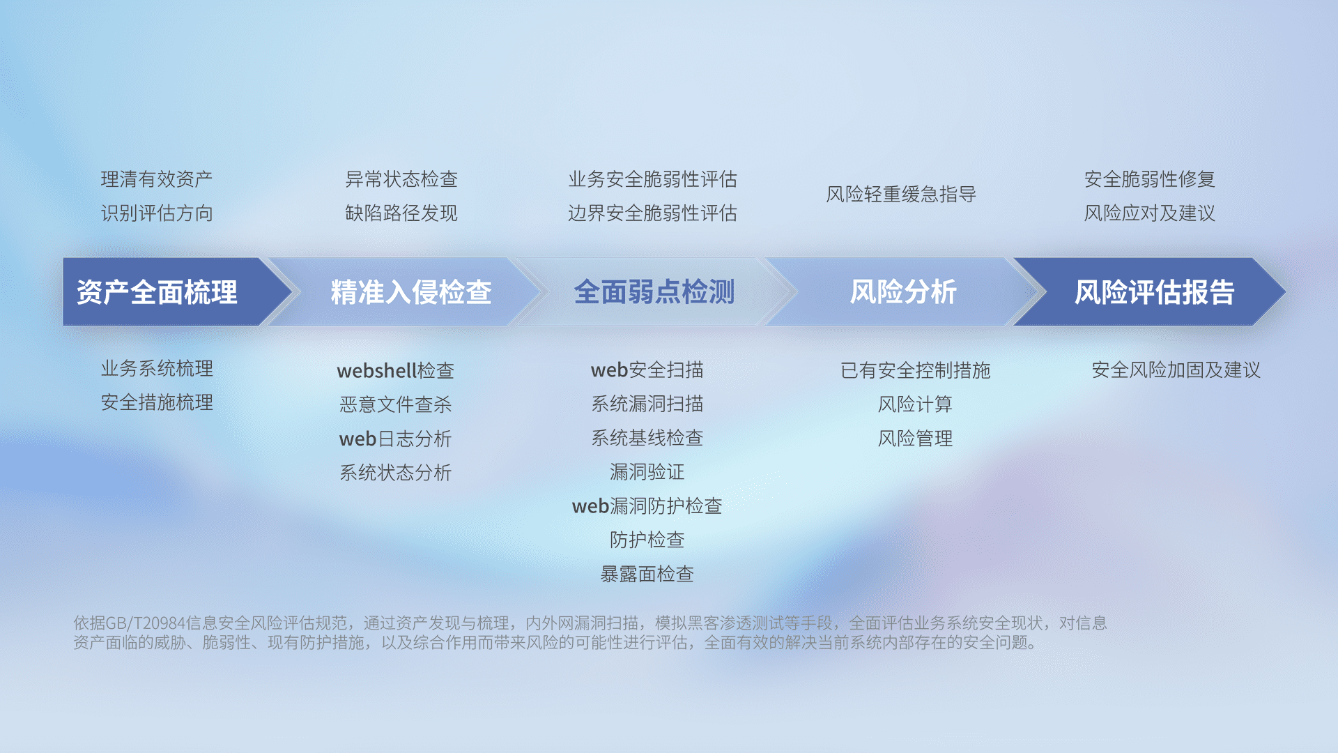 针对客户行业特性,,以专业的安全服务+多厂商联合解决方案提供专属的一站式安全管理服务,,,帮助客户全面感知网络空间威胁,,基于识别、、检测、、、分析、、、、防护、、监测、、、、响应的服务理论模型,,从方案咨询、、集成交付、、评估验证、、优化加固、、运维运营,,,致力于为客户提供完整的闭环管理式安全服务。。。。以实战经验为客户打造高抵御风险的安全体系,,帮助客户发现威胁、、、对抗威胁、、处置威胁,,,,不断积累安全对抗能力,,持续保障数字化安全。。