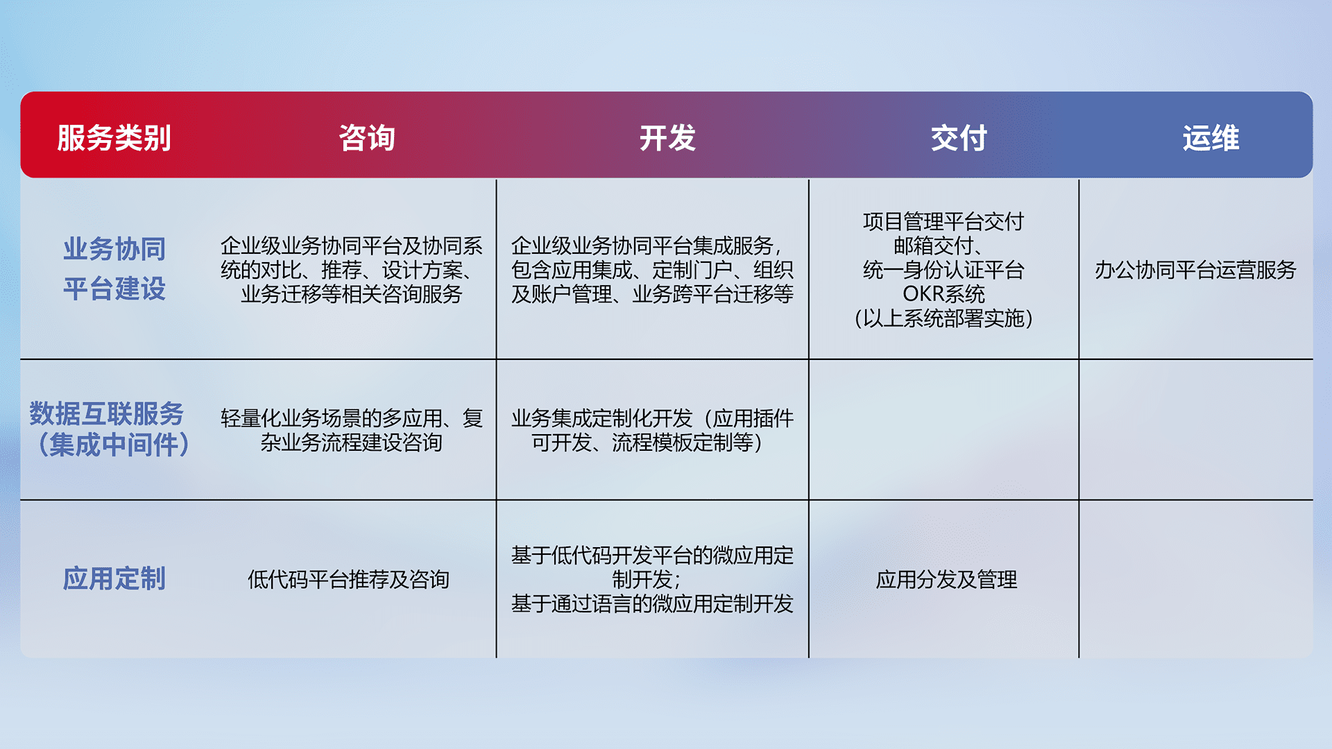 针对钉钉、、、、企微、、IDaas等平台级产品提供产品的规划、、、方案、、交付、、、定制化开发等服务,,,,实现如统一协同办公、、、、智能客户服务、、混合会议管理、、、、智能数据查询、、等业务场景,,,实现数字化转型。。。